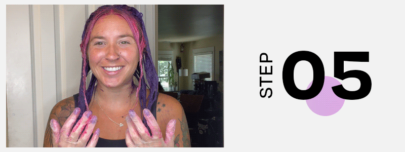 STEP 04: Section off previously tied up hair into four separate sections. Take a moment to enjoy serving up alien vibe realness, and then apply color using your hands, starting from the roots and working your way to the ends.