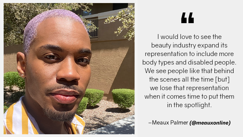 I would love to see the beauty industry expand its representation to include more body types and disabled people disabled. Recently, I’ve noticed a push to be more inclusive to People of Color, which I appreciate. However, still, more work could be done. Allowing Black people with a variety of hairstyles is definitely something I would like to see represented. I want to see more afros, braided styles, Bantu knots, and locs in print, media, and runways. Finally, I think that the beauty industry could add more people that don’t fit into the gender binary. It’s funny because we see people like that behind the scenes all the time. It seems like we lose that representation when it comes time to put them in the spotlight.