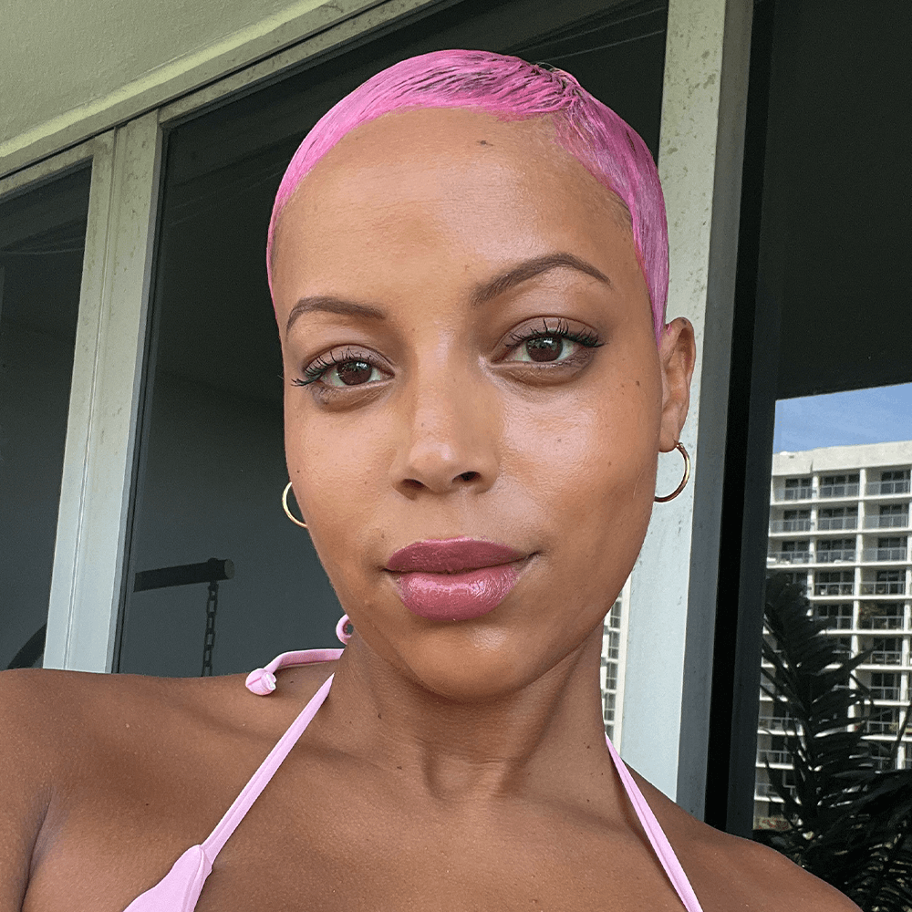 person with pastel pink hair color on pre-lightened buzz cut