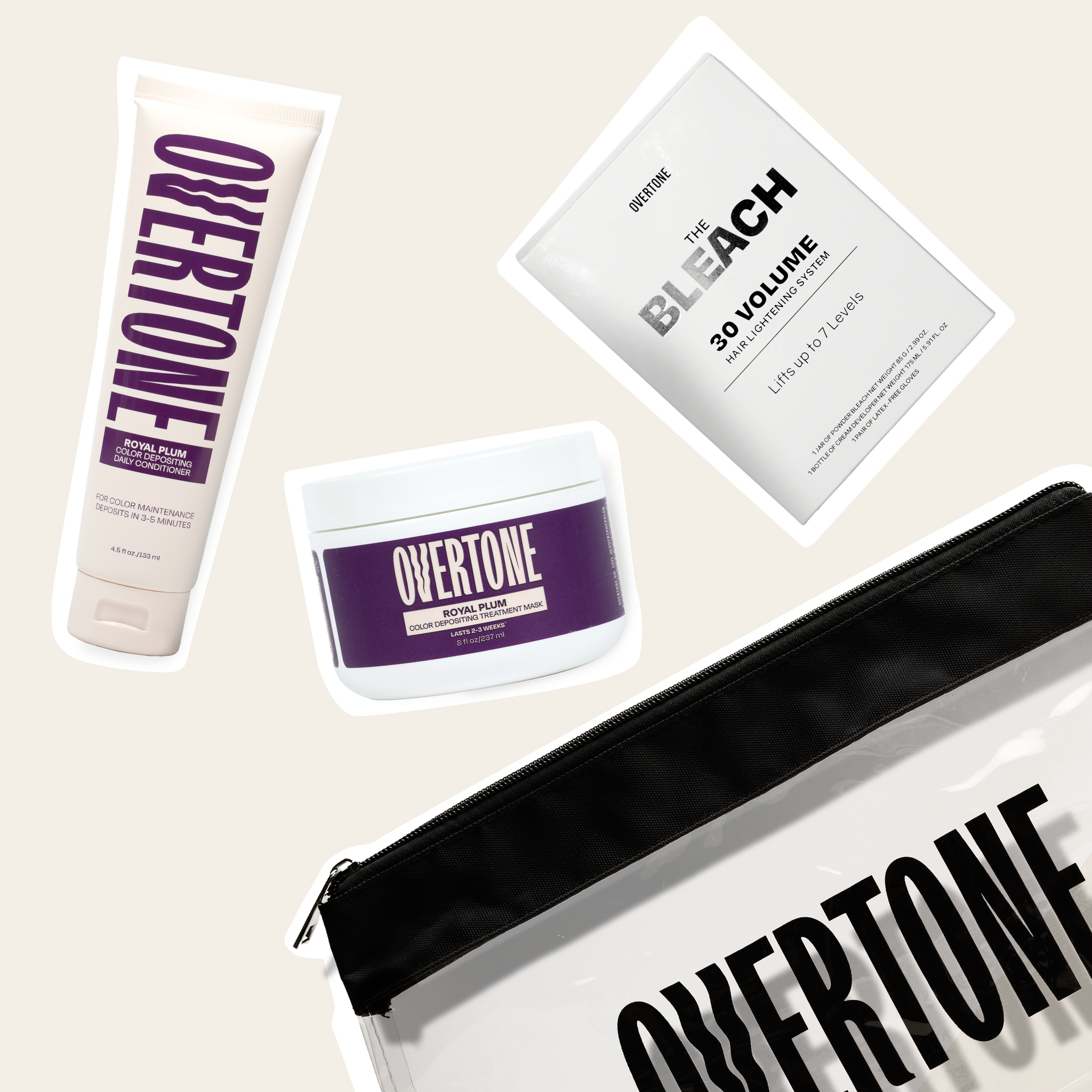 Overtone Vivid Violet color depositing treatment mask jar with purple color swatch on a white background