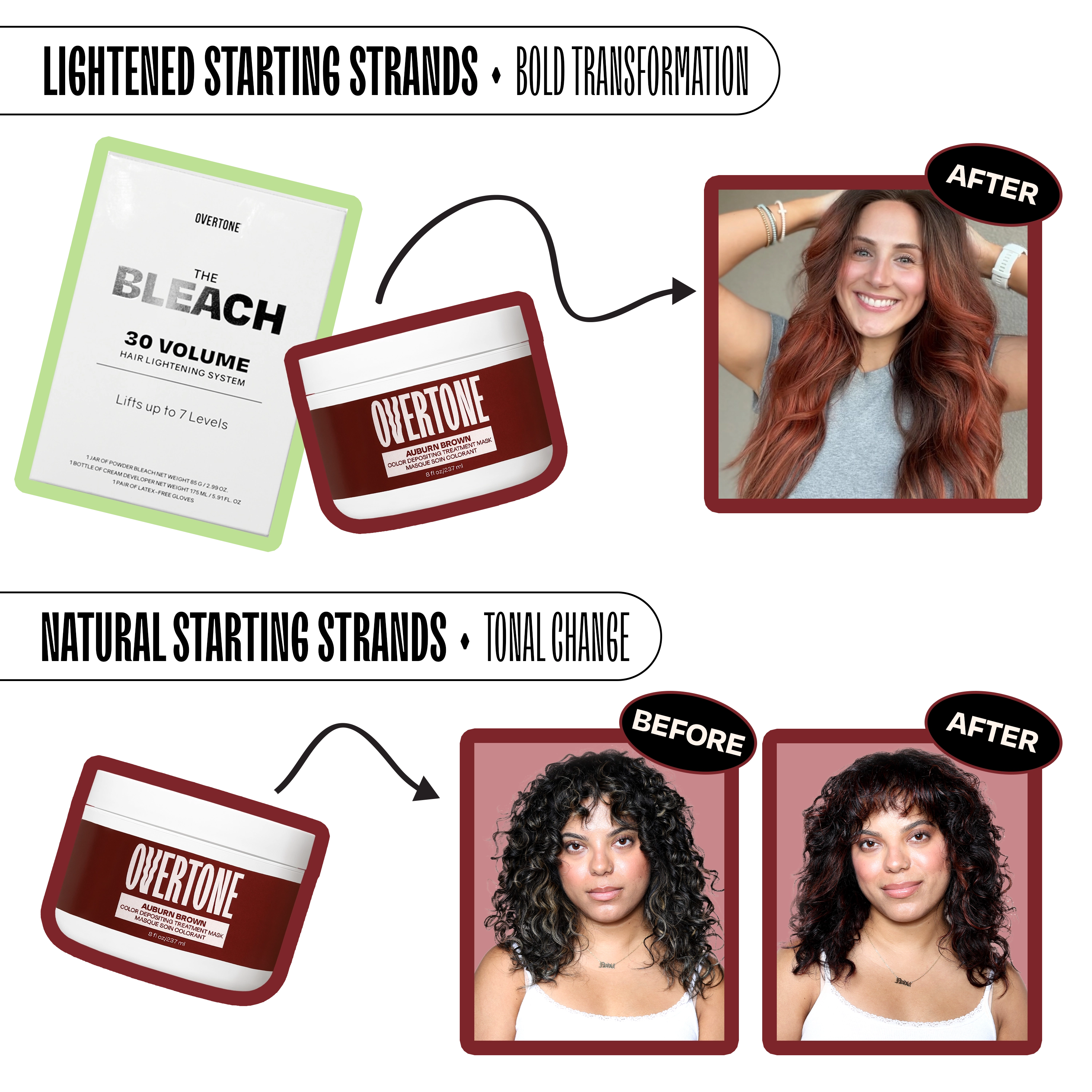 On blonde hair, Auburn Brown appears coppery red and warm. On brown hair, it adds auburn warmth and dimension. On black hair, it creates subtle warmth rather than brightness.
