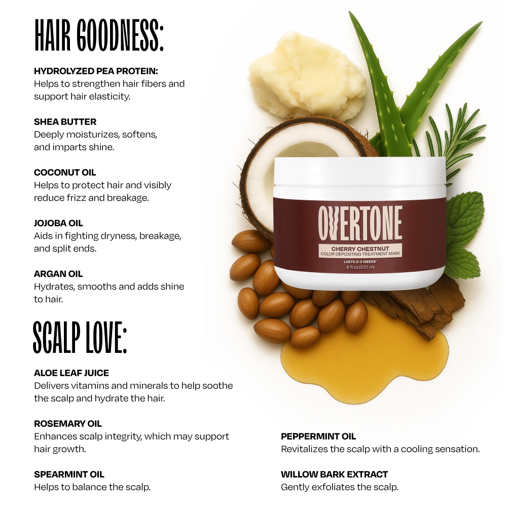 Color Note: Results will vary depending on your starting hair shade. While our Cherry Chestnut hue delivers a rich, earth-inspired cherry tone on medium to dark brown hair, it can appear more vibrant and plum-like on lighter shades. If your hair is naturally blonde, highlighted, or lighter brown, you may see a more pronounced purple/plum tone. We recommend a strand test prior to full application to ensure you achieve your desired look.