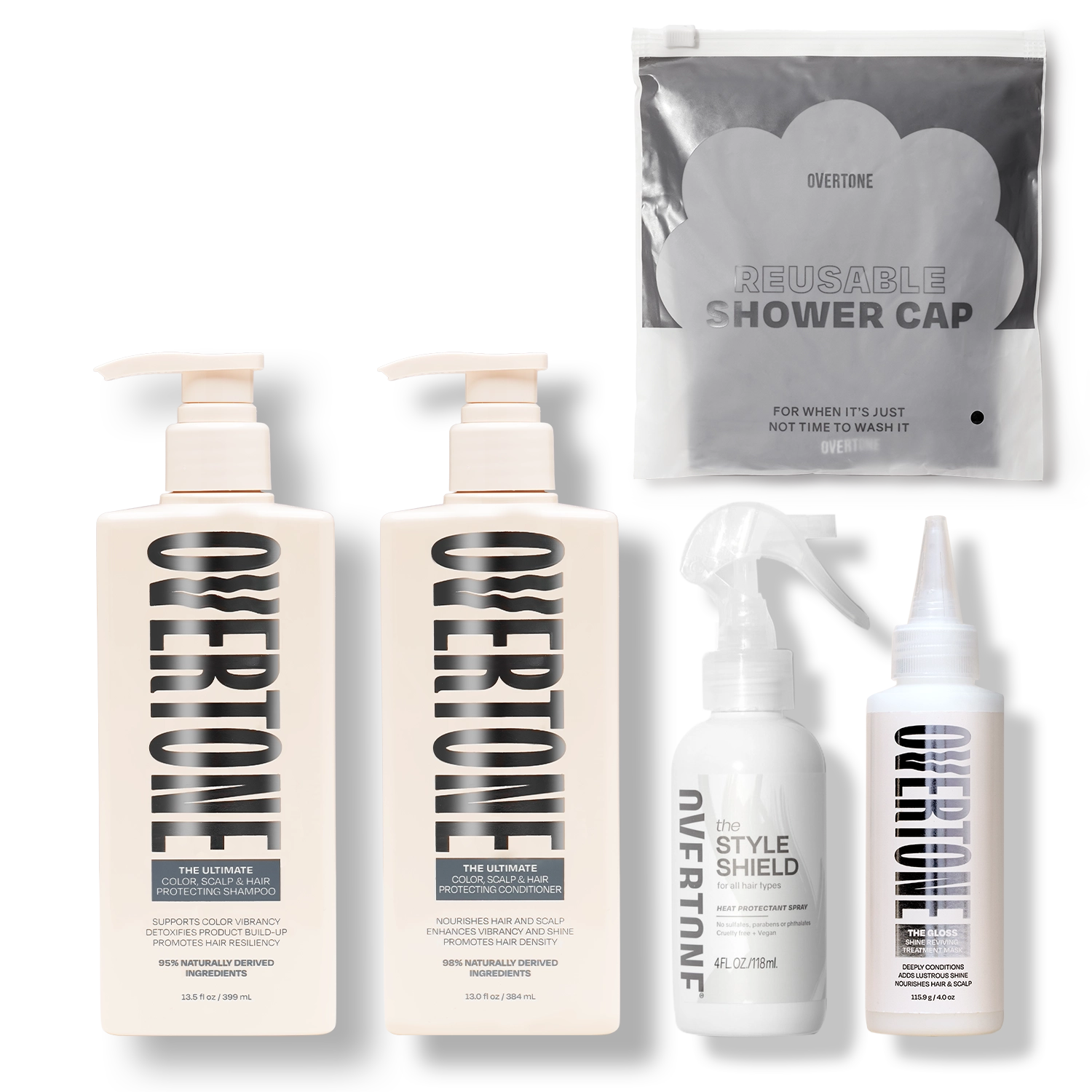 This bundle is designed to keep color fresh and hair strong. Featuring The Ultimate Duo Shampoo & Conditioner, The Gloss Shine Mask, The Style Shield, and a Reusable Shower Cap, it’s the perfect protection plan for vibrant, healthy-looking hair.